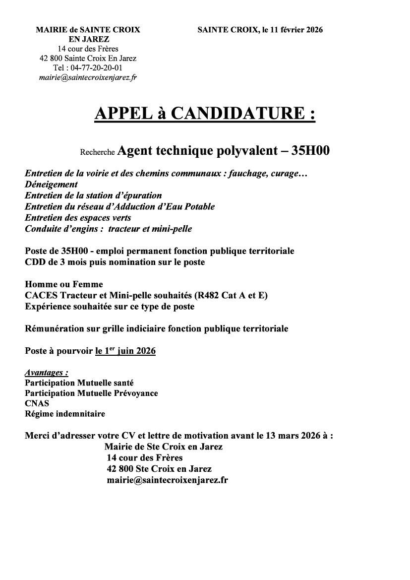Message de la Mairie de Sainte-Croix en Jarez 12/2/26 La Mairie de Sainte-Croix en Jarez recrute un agent technique