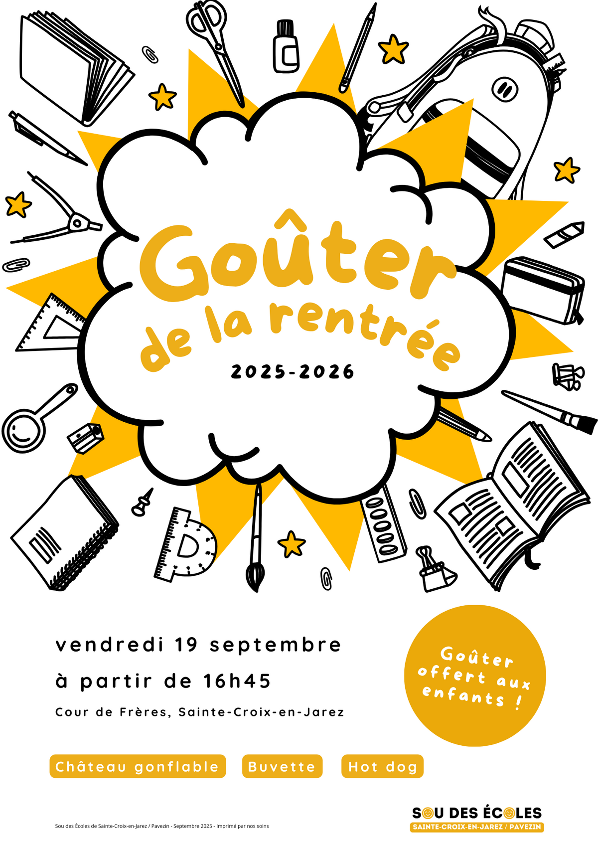 Le Sou des écoles vous donne rendez-vous le vendredi 19 septembre, à partir de 16h45 pour partager le goûter de la rentrée, dans la cours des Frères de la chartreuse de Sainte-Croix-en-Jarez !