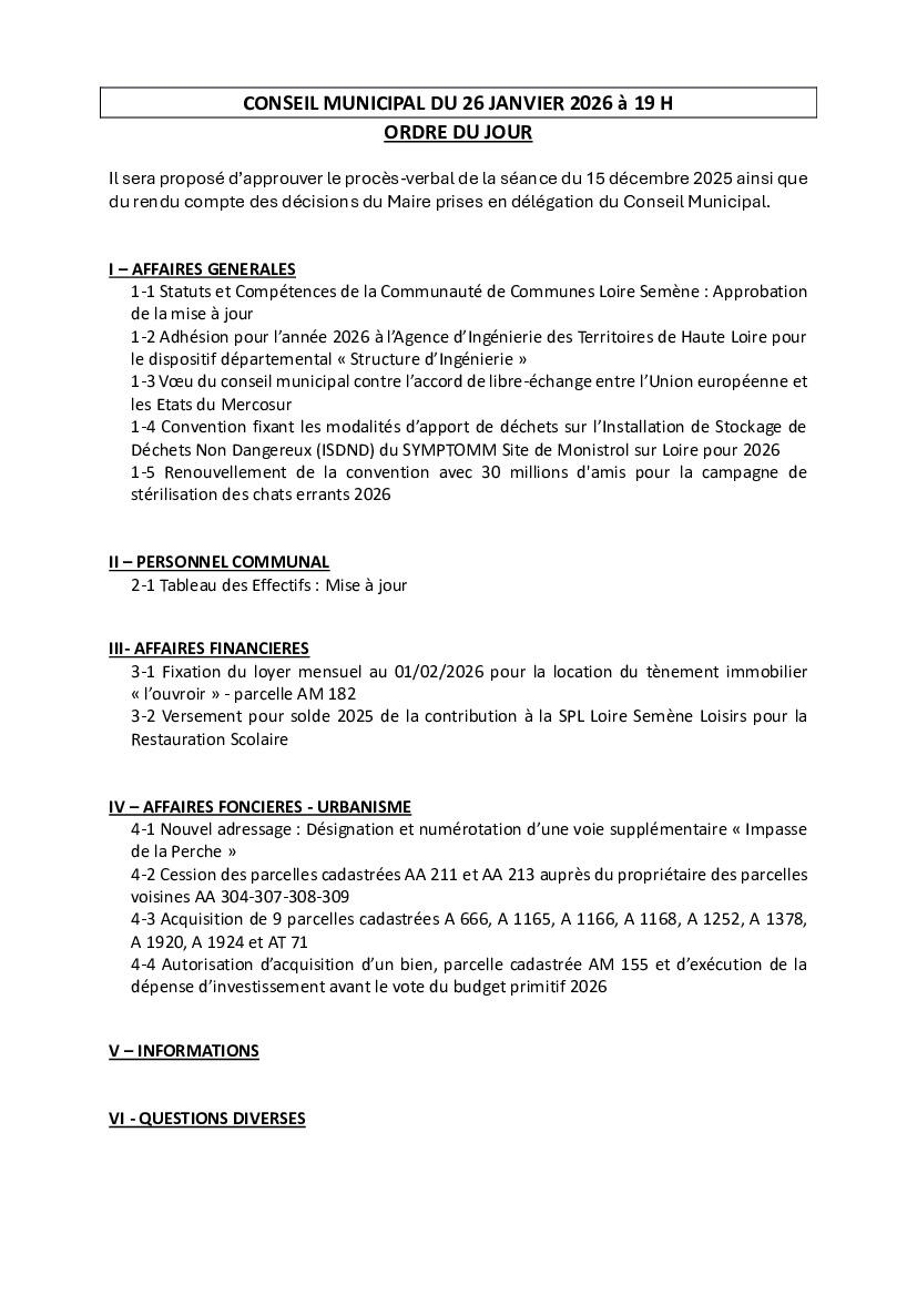 🔴 Ordre du jour du Conseil municipal - 26/01/2026
