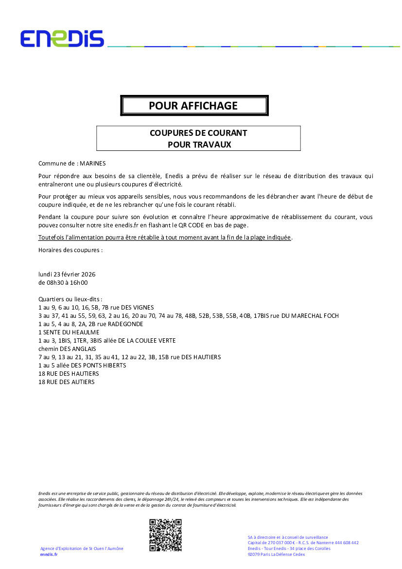 Coupure électricité prévue le 23/02/2026 entre 8h30 et 16h