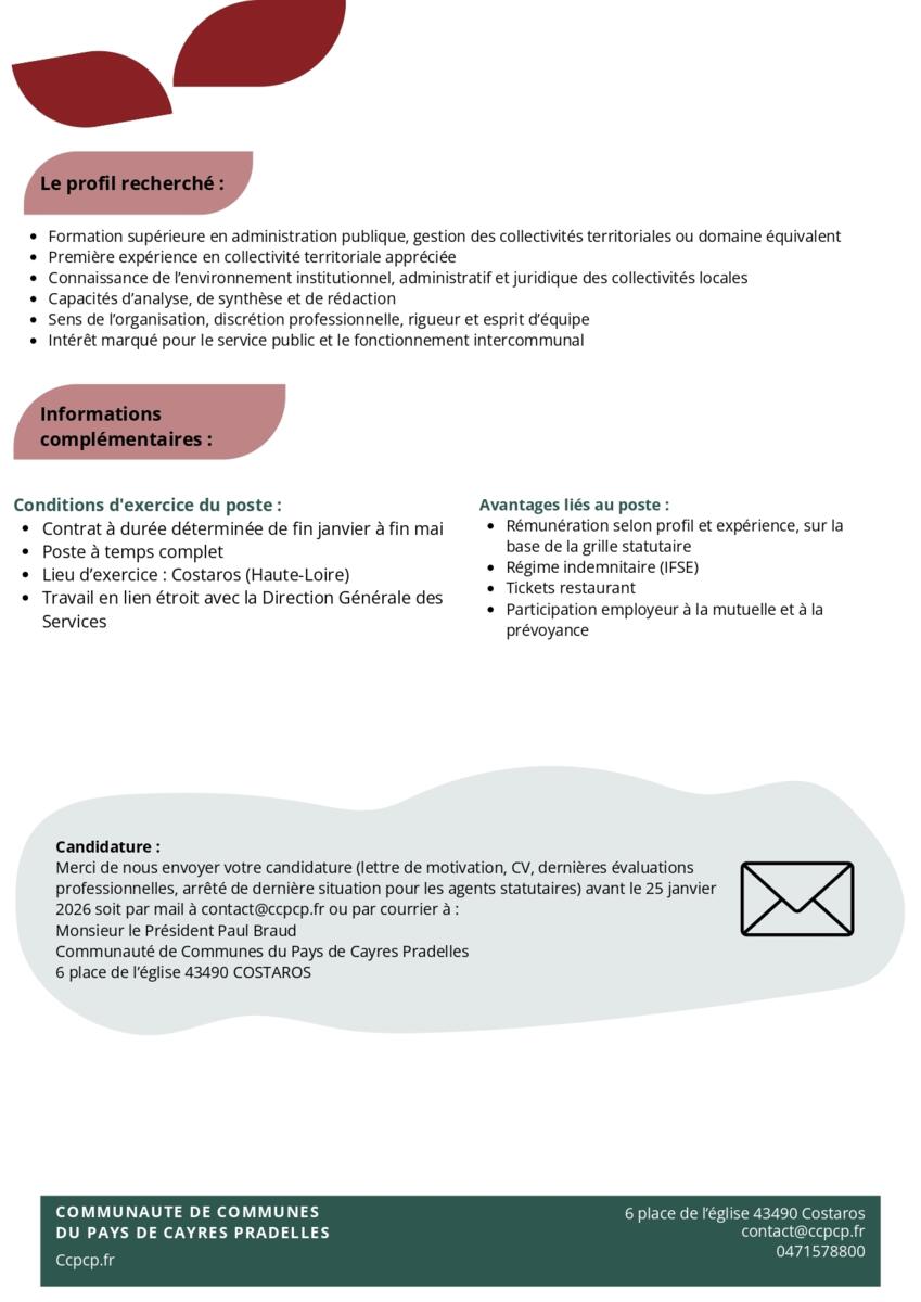 La Communauté de Communes du Pays de Cayres-Pradelles recrute un(e) Adjoint(e) de direction, en appui à la Direction Générale des Services