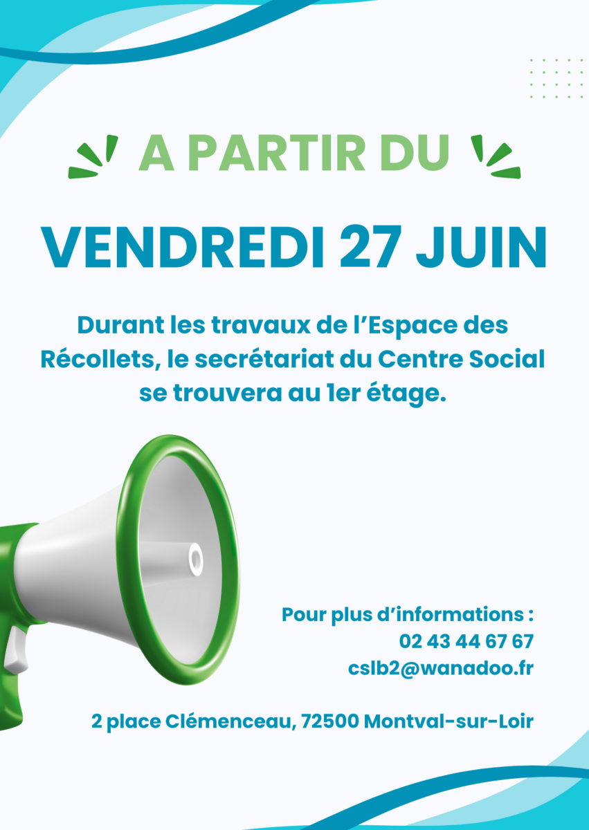 ⚠️ En raison des travaux de l'Espace des Récollets, à partir du vendredi 27 juin 2025 le secrétariat du Centre Social sur trouvera au 1er étage.