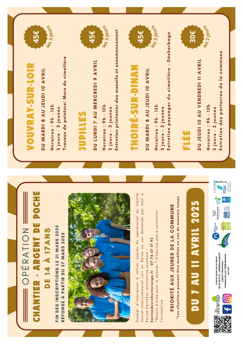 Tu as entre 14 et 17 ans et tu veux te faire un peu d’argent de poche tout en rendant service à ta commune ? C’est le moment de t’inscrire aux chantiers Argent de poche organisés par le Centre Social Loir et Bercé !