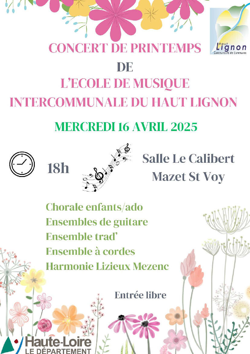 L'école de musique intercommunale du Haut-Lignon vous invite à son concert de printemps le 16 avril à 18 heures à la salle du Calibert au Mazet Saint-Voy. Entrée libre.