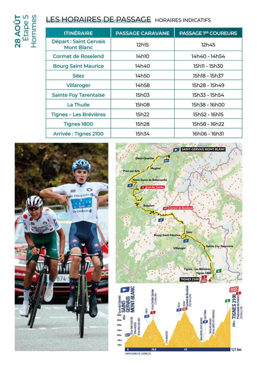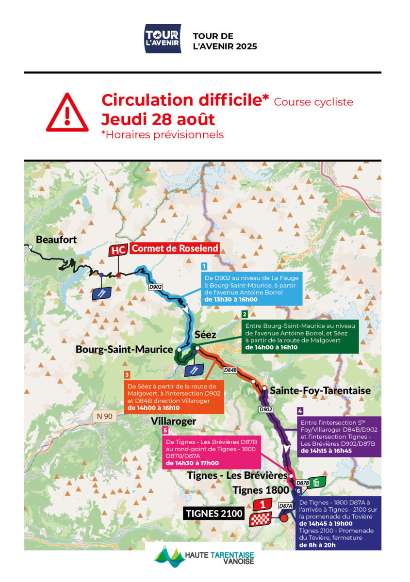 ➡️ Jeudi 28 août, l’étape passe par le Cormet de Roselend, Bourg-Saint-Maurice, Séez, Villaroger, Sainte Foy Tarentaise, jusqu’à l’arrivée à Tignes Le Lac. Consultez la carte de circulation du Jeudi 28 août pour les informations détaillées.