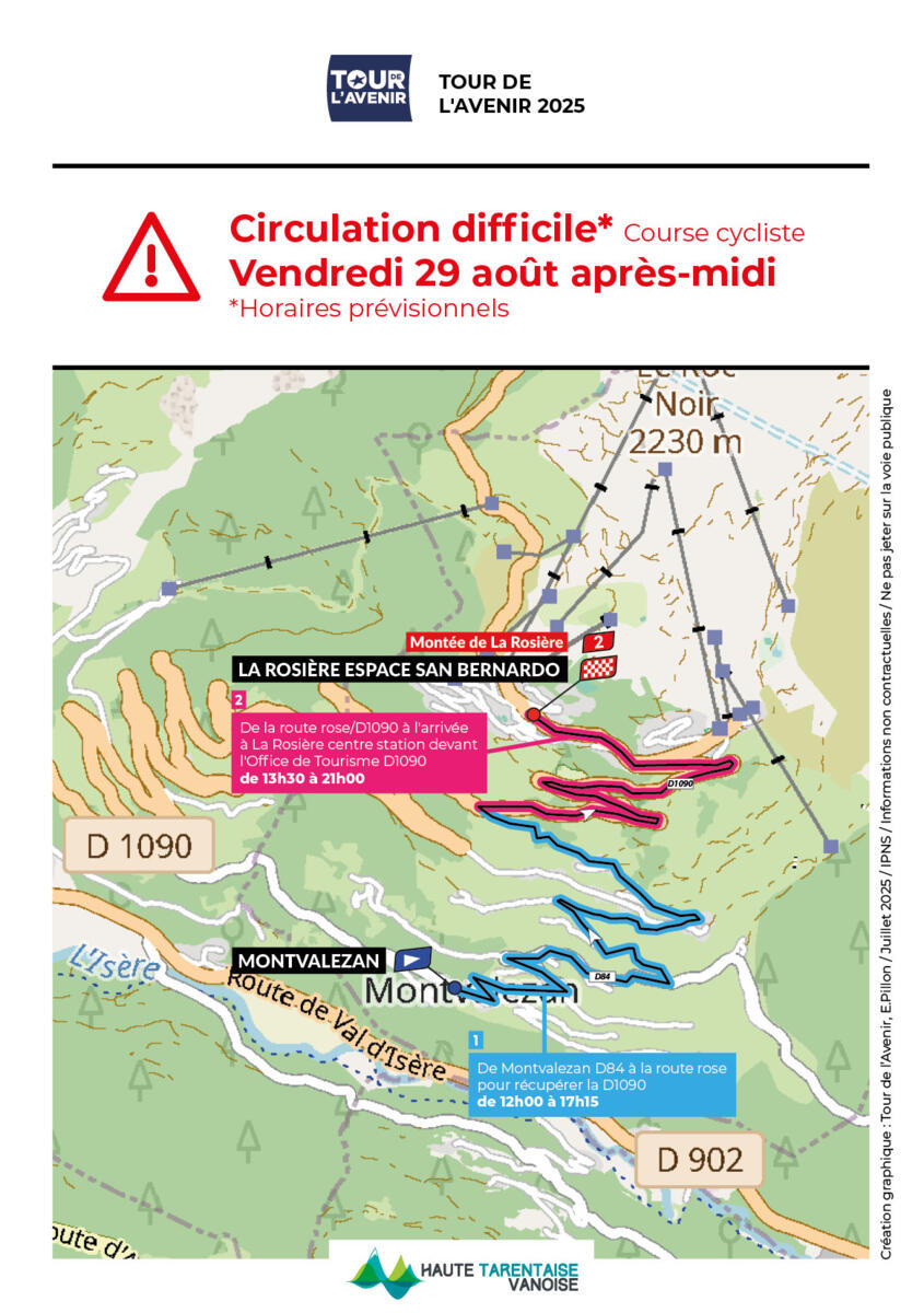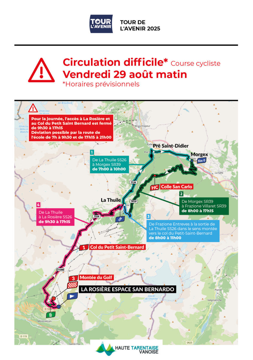 ➡️ Vendredi 29 août, les étapes se concentrent sur les communes de Séez et Montvalezan/La Rosière. Pour cette journée, l’accès à La Rosière et au col du Petit Saint Bernard est fermé de 9h30 à 17h15. 🚌🔴 La ligne S80 (Bourg-Saint-Maurice - La Rosière - col du Petit Saint Bernard) ne fonctionnera pas le 29 août compte tenu du tracé de la course.