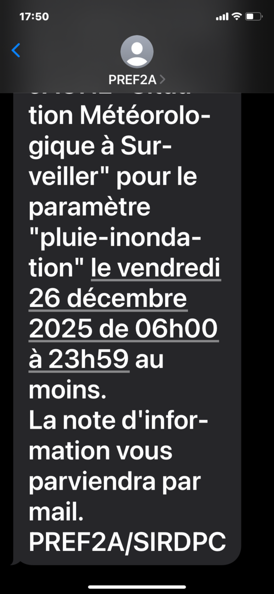 Situation météorologique jaune orage 25/12/25 Bonjour, la corse du sud placée en situation météorologique jaune . Communiqué ci joint . Antoine