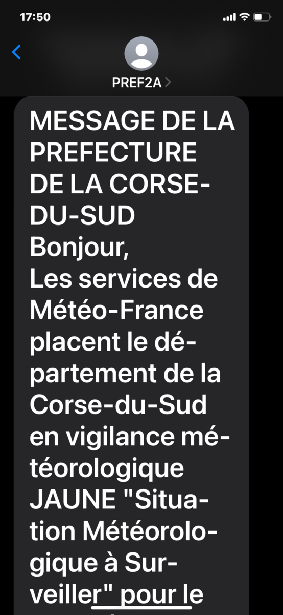 Bonjour, la corse du sud placée en situation météorologique jaune . Communiqué ci joint . Antoine