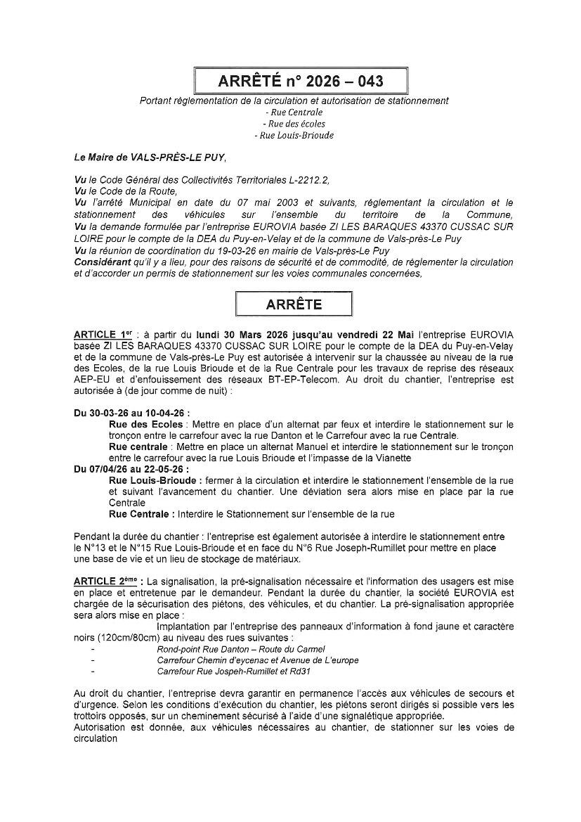 INFO TRAVAUX EAU POTABLE- VALS PRES LE PUY 30/3/26 INFO TRAVAUX RESEAU EAU POTABLE rue Louis Brioude-VALS PRES LE PUY