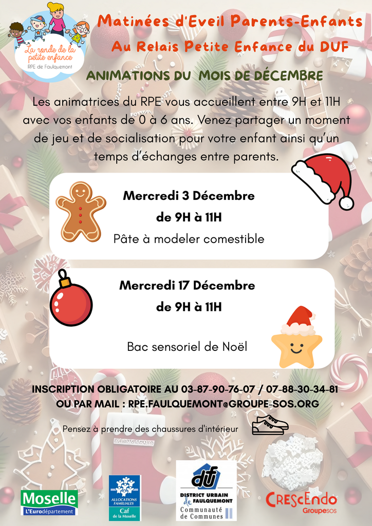 Le Relais Petite Enfance du DUF vous accueille avec vos enfants de 0 à 6 ans pour deux matinées d’animations en décembre : 👶 Jeux, découvertes sensorielles et échanges entre parents au programme.