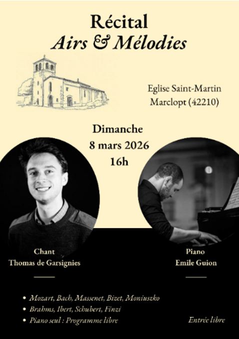 L’article Récital de musique lyrique : Dimanche 8 mars 16h Église Saint-Martin de Marclopt est apparu en premier sur Paroisse Saint Timothée en Forez.