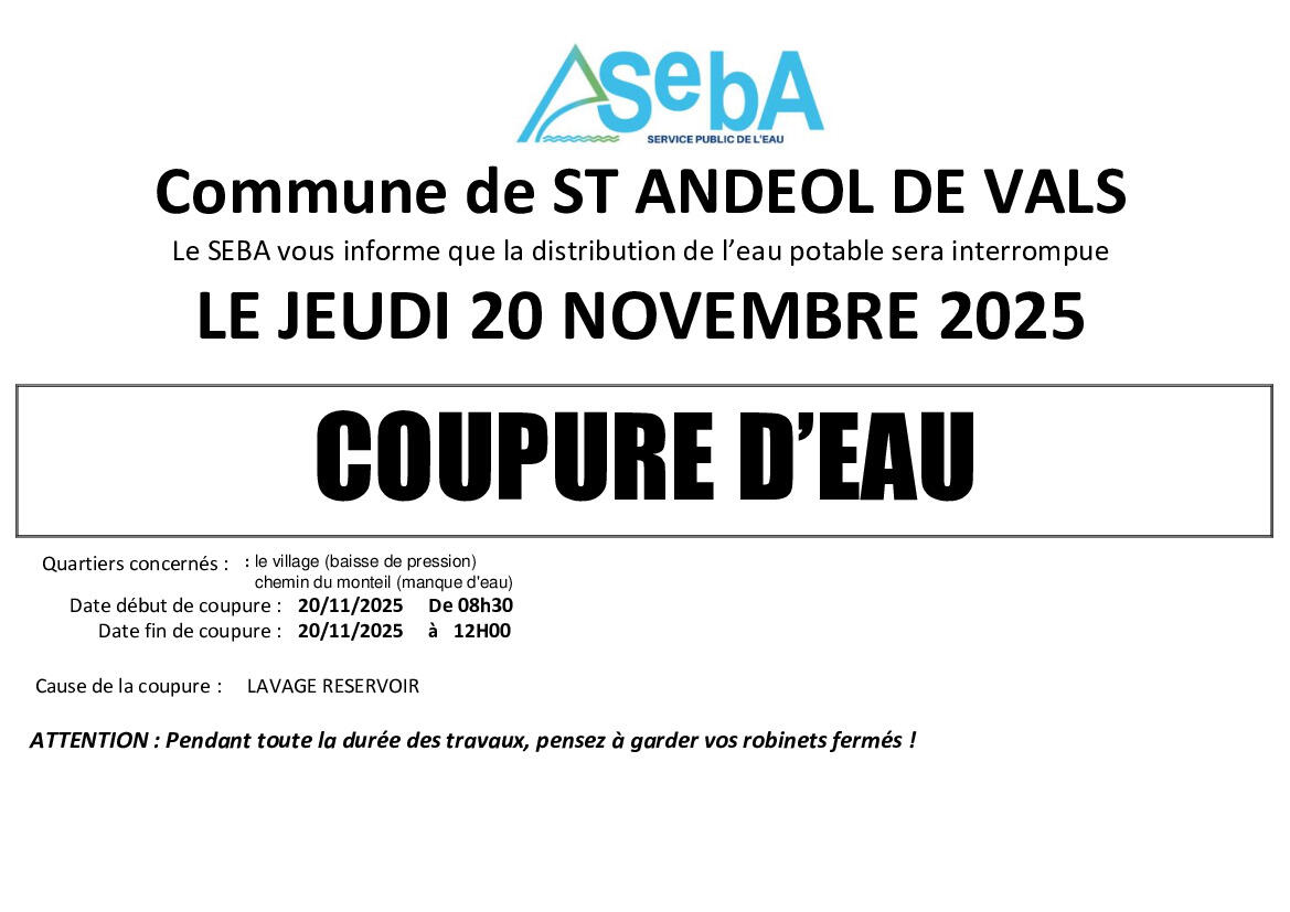 AVIS DE COUPURE D'EAU ST ANDEOL DE VALS 20/11/2025