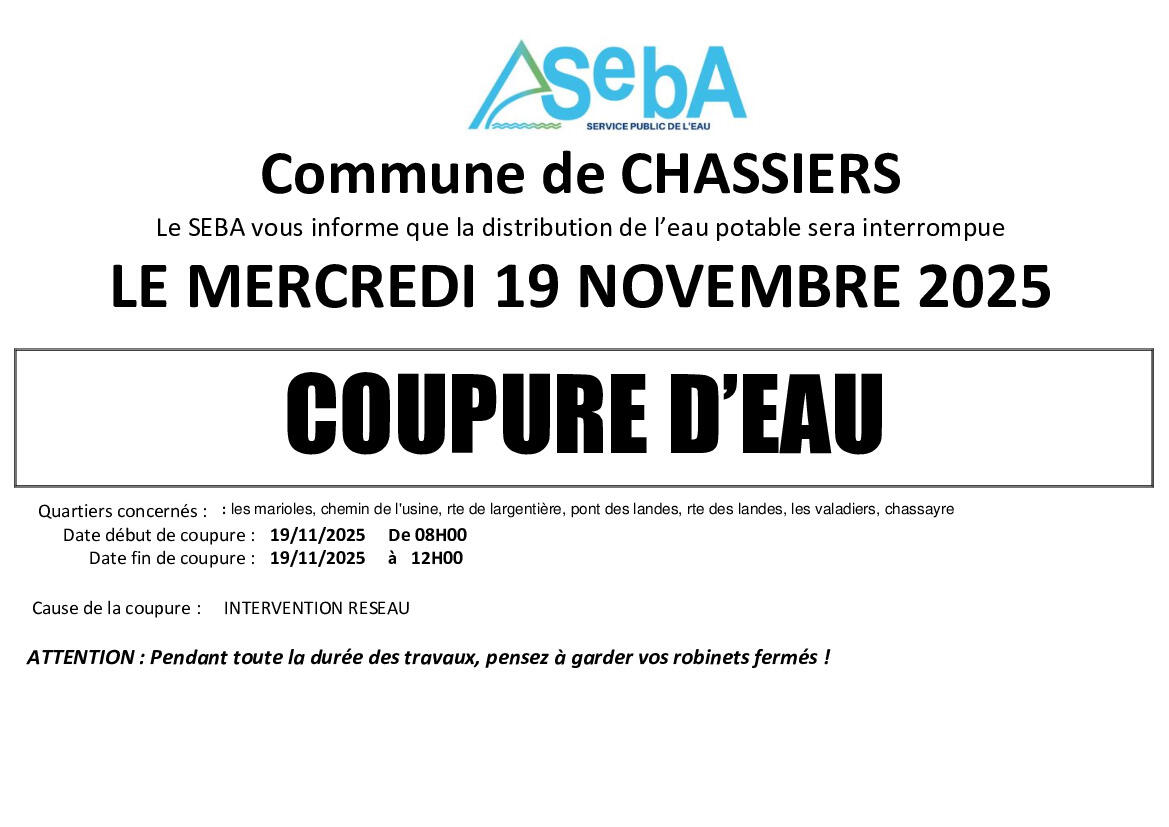 AVIS DE COUPURE D'EAU CHASSIERS LE 19/11/2025