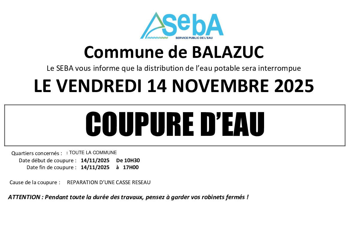 AVIS DE COUPURE D'EAU BALAZUC 14/11/2025