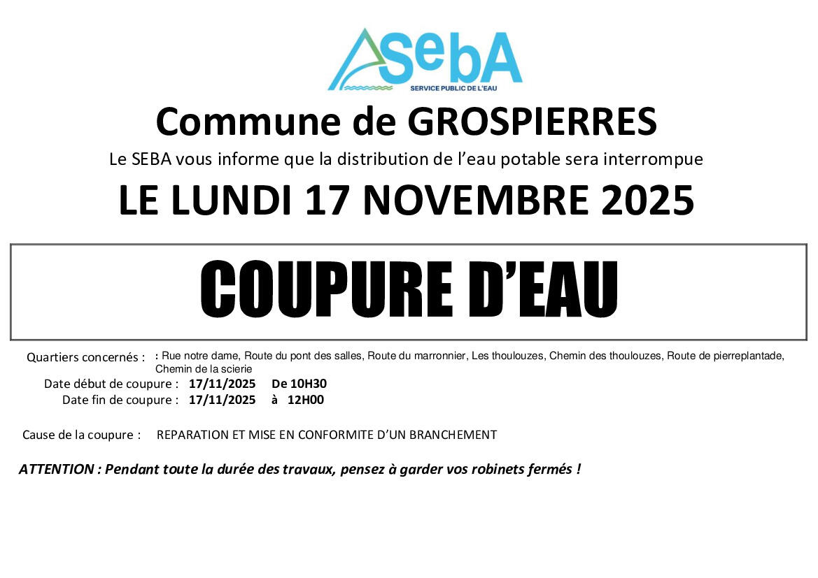 AVIS DE COUPURE D'EAU GROSPIERRES LE 17/11/2025