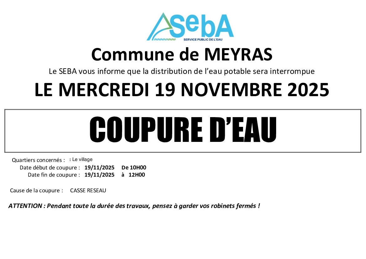 AVIS DE COUPURE D'EAU MEYRAS 19/11/2025
