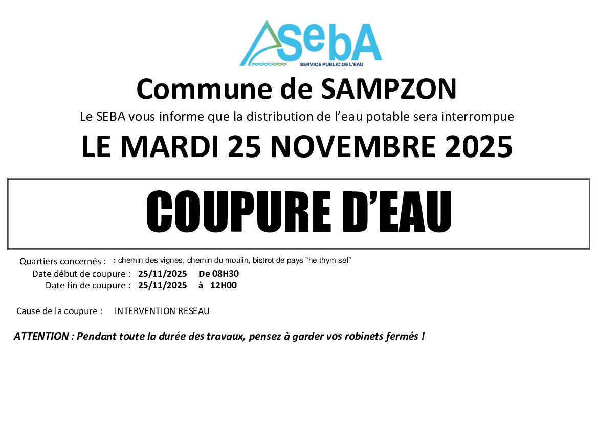 AVIS DE COUPURE D'EAU SAMPZON 25/11/2025