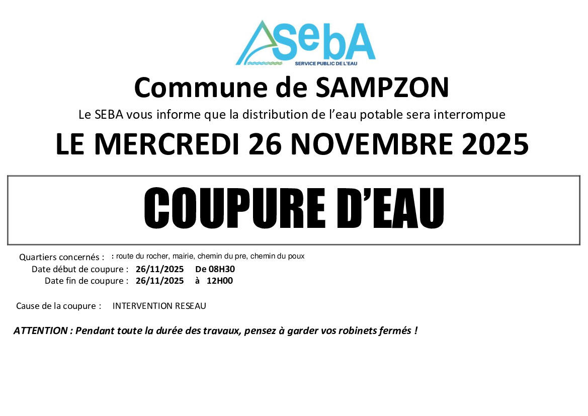 AVIS DE COUPURE D'EAU SAMPZON 26/11/2025