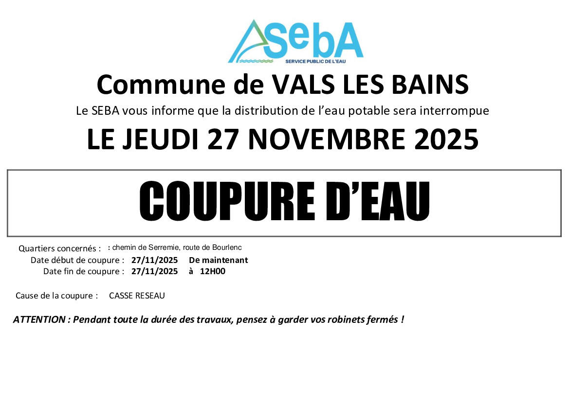 AVIS DE COUPURE D'EAU VALS LES BAINS 27/11/2025