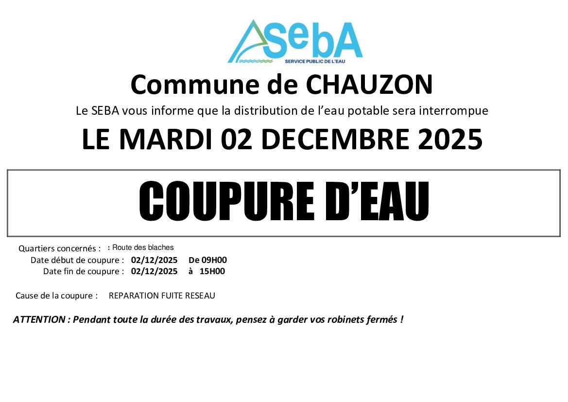 AVIS DE COUPURE D'EAU CHAUZON LE 02/12/2025