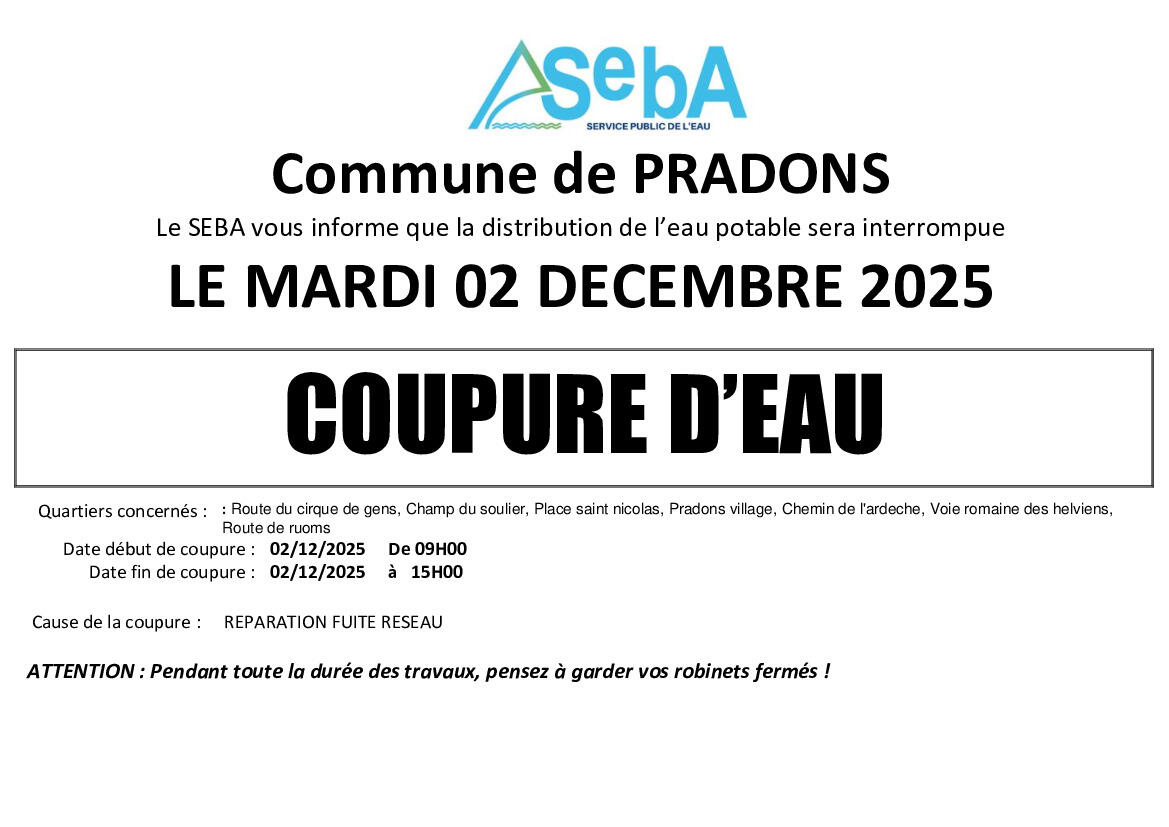 AVIS DE COUPURE D'EAU PRADONS LE 02/12/2025