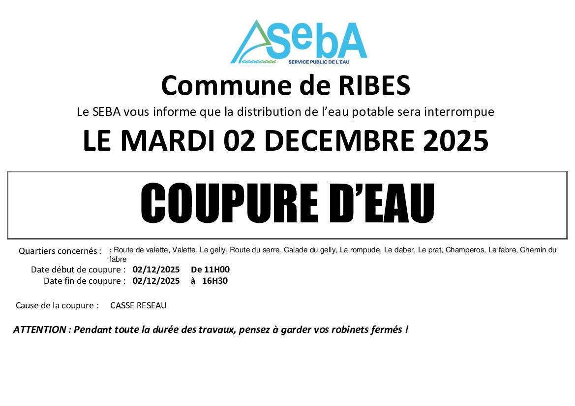 AVIS DE COUPURE D'EAU RIBES LE 02/12/2025