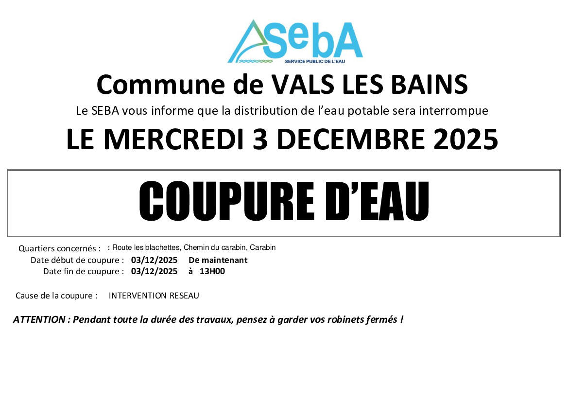 AVIS DE COUPURE D'EAU VALS LES BAINS LE 03/12/2025