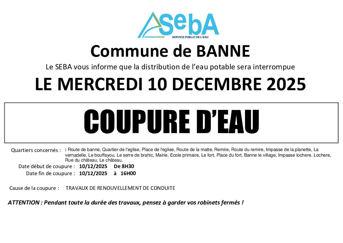 AVIS DE COUPURE D'EAU BANNE LE 10/12/2025