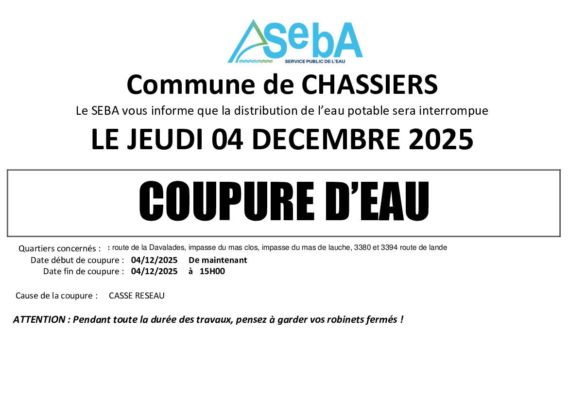 AVIS DE COUPURE D'EAU CHASSIERS LE 04/12/2025