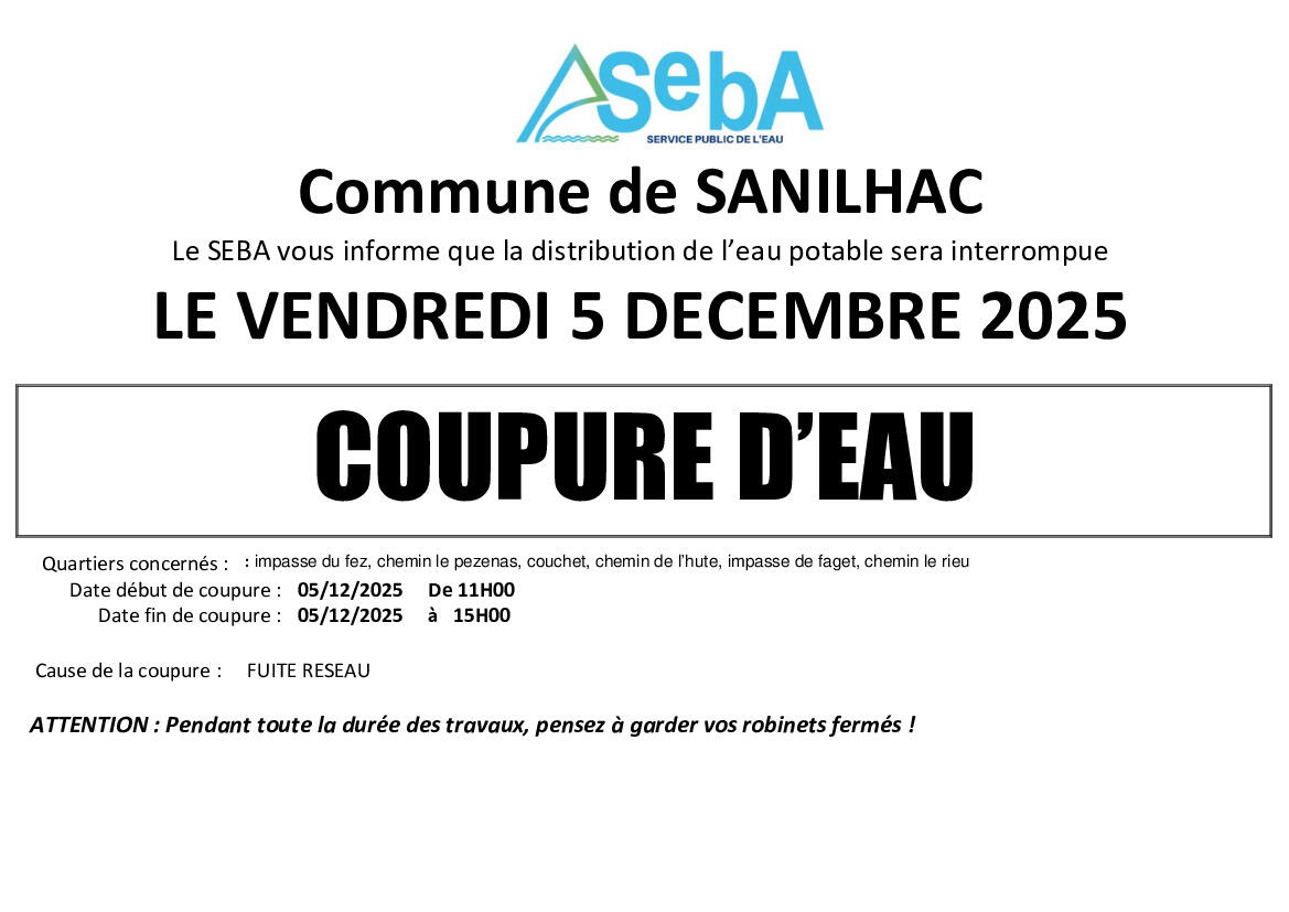 AVIS DE COUPURE D'EAU SANILHAC LE 05/12/2025