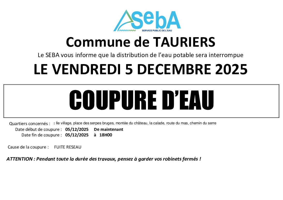 AVIS DE COUPURE D'EAU TAURIERS LE 05/12/2025