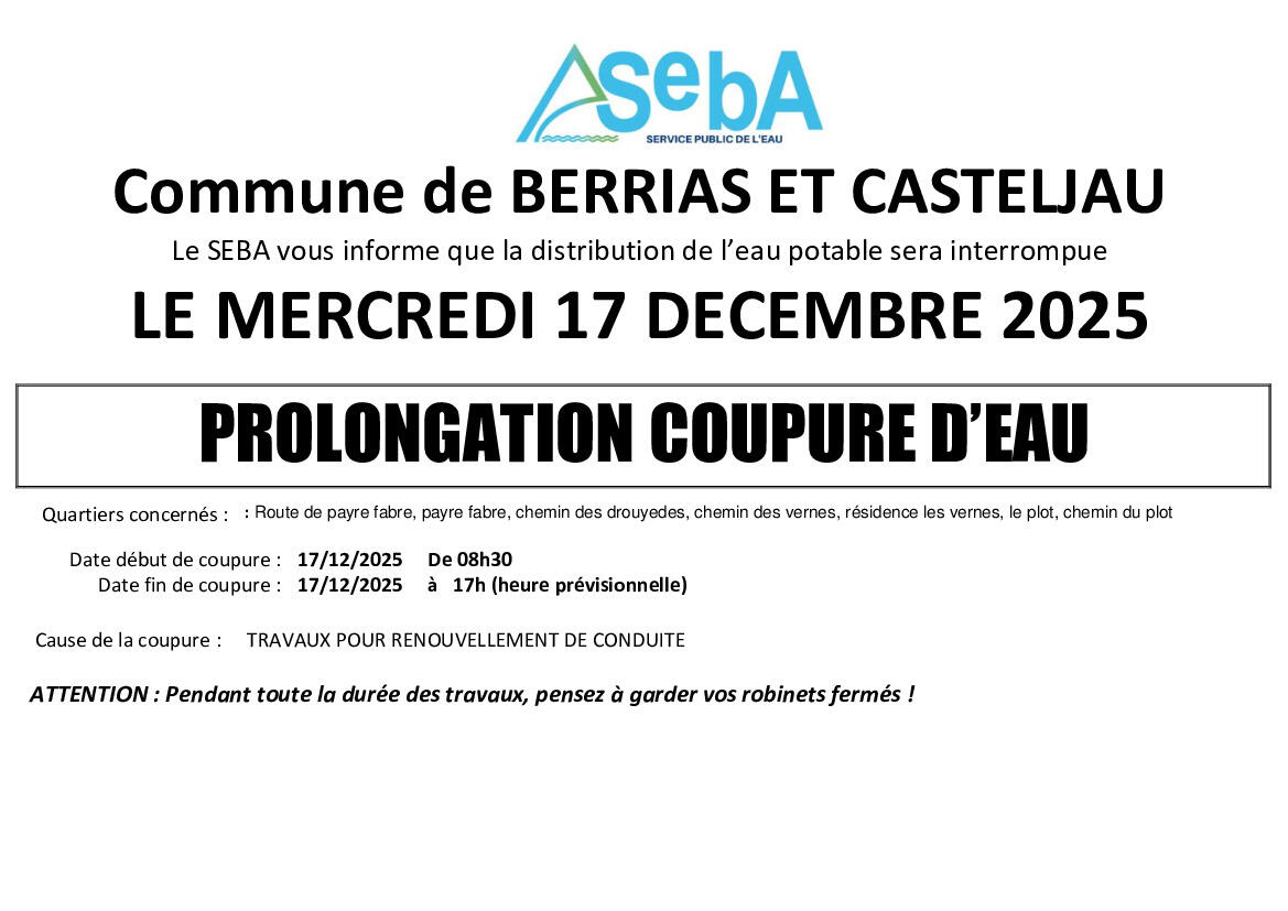 AVIS DE COUPURE D'EAU BERRIAS ET CASTELJAU LE 17/12/2025