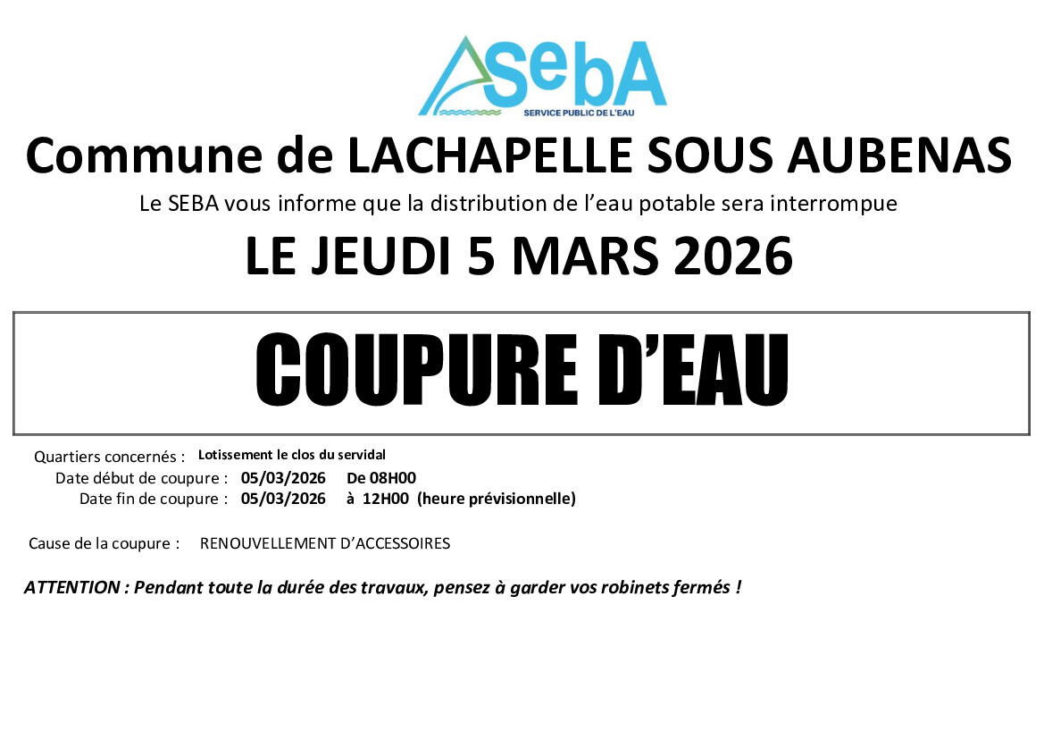 AVIS DE COUPURE D'EAU LACHAPELLE SOUS AUBENAS LE 05/03/2026