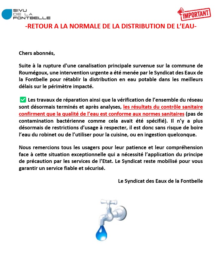 RETOUR A LA NORMALE DE LA DISTRIBUTION D'EAU POTABLE
