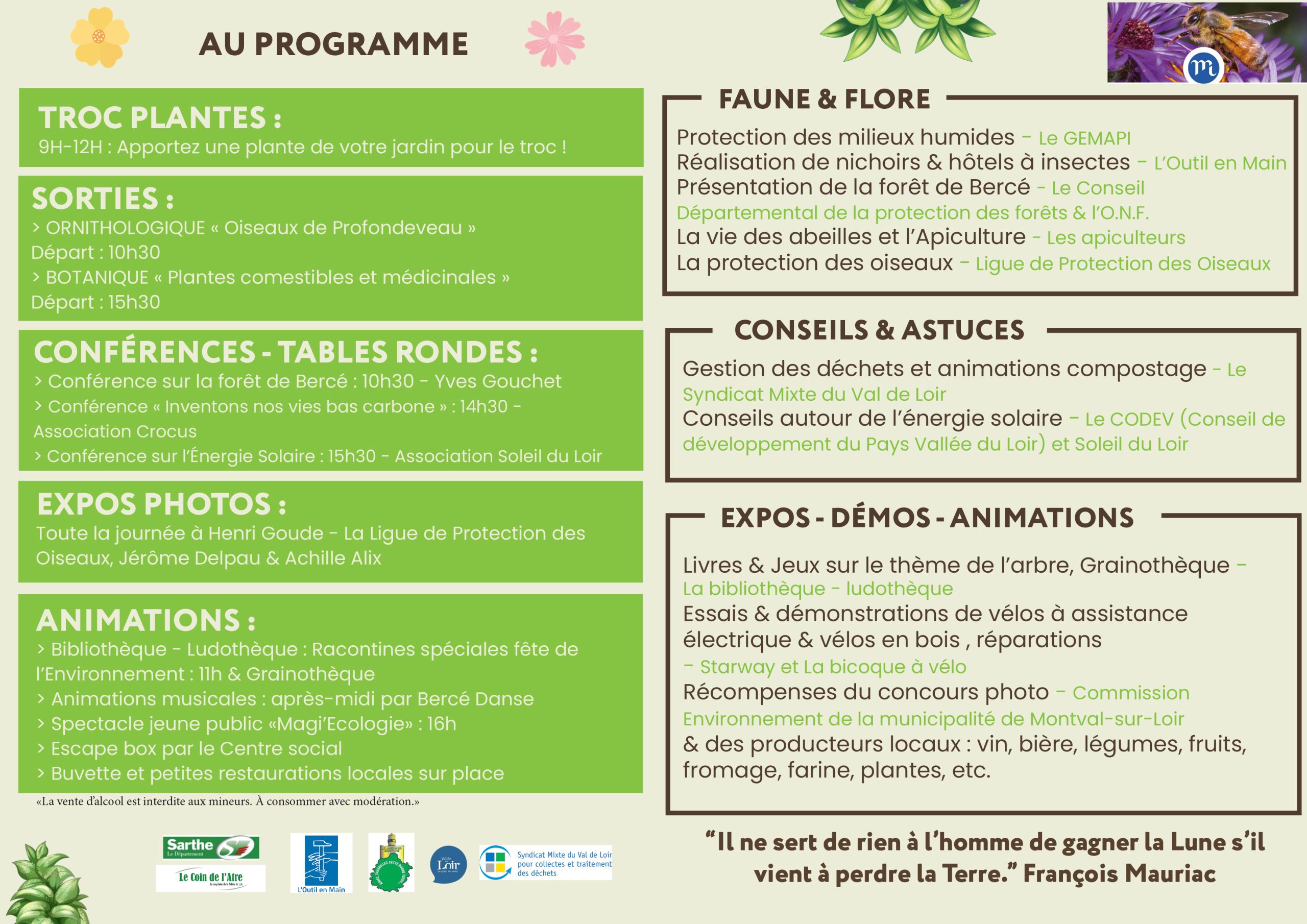 La commission Environnement de la municipalité de Montval-sur-Loir organise la 3ème édition de sa fête de l’Environnement le samedi 13 avril de 9h à 17h, salle et Parc Henri Goude à Château-du-Loir.