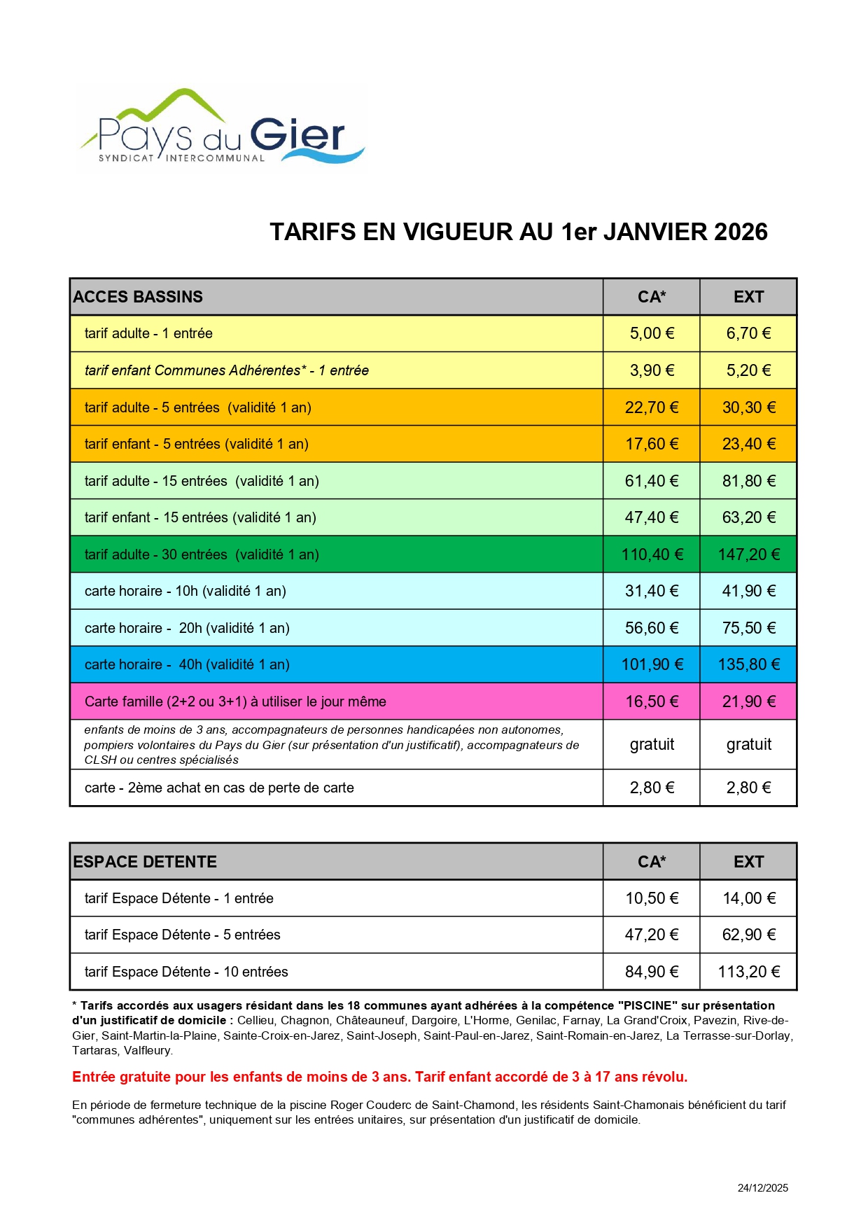 Changement des tarifs au 1er janvier 2026 24/12/25 Au 1er janvier prochain, nos tarifs seront les suivants : Source : Piscine Intercommunale André Chalazon