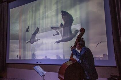 Sur scène, tout commence par une photo : celle d’un grand-oncle élégant à bord d’un bateau. Au son de la contrebasse, de la flûte et du saxophone, les images défilent. Du cercle polaire à la péninsule arabique, de l’Extrême-Orient à la lagune vénitienne, les clichés et les sons s’accompagnent en rythme. Une alliance délicate qui rend hommage aux peuples en errance.