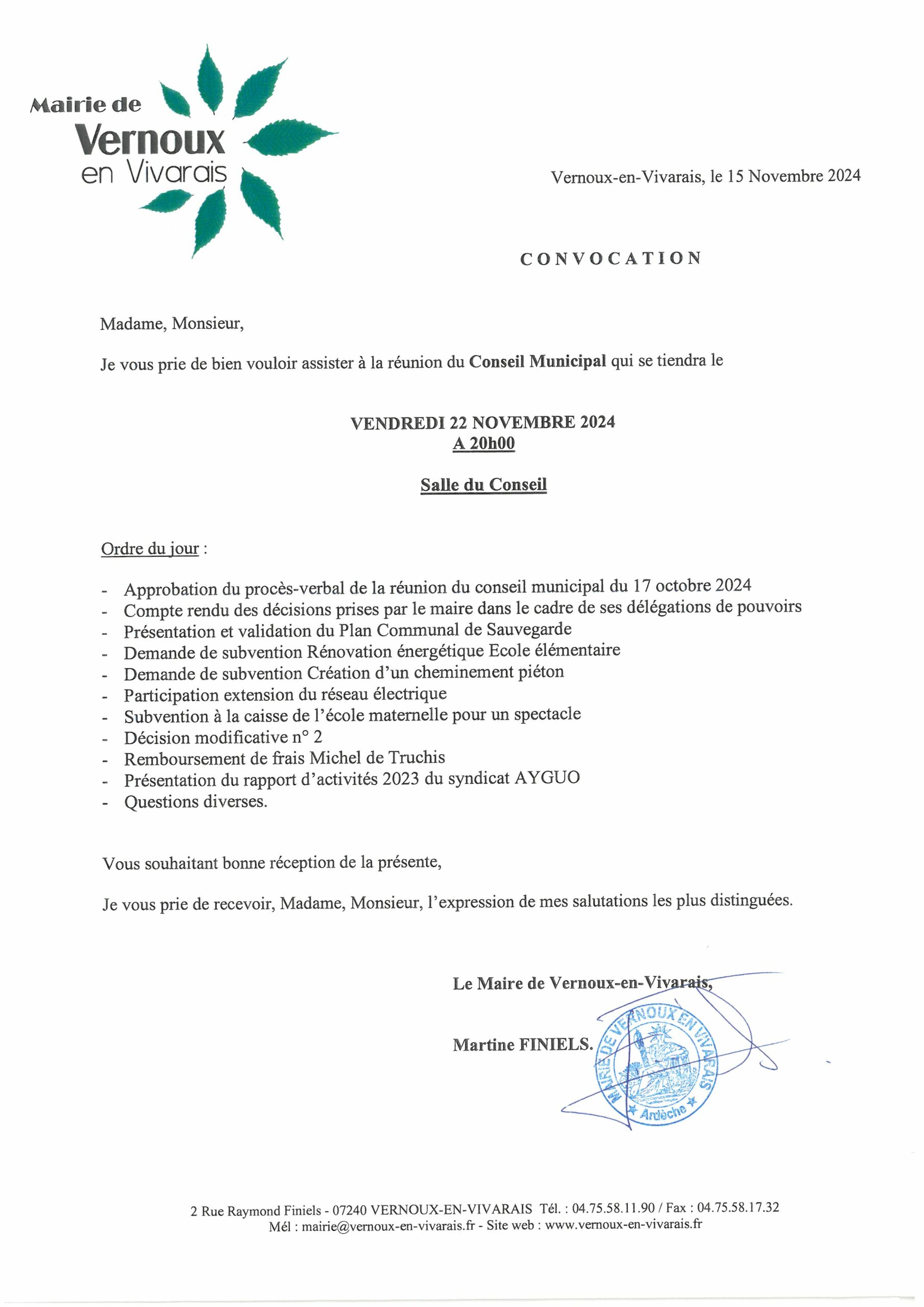 Conseil Municipal vendredi 22/11 -20h Salle du Conseil
