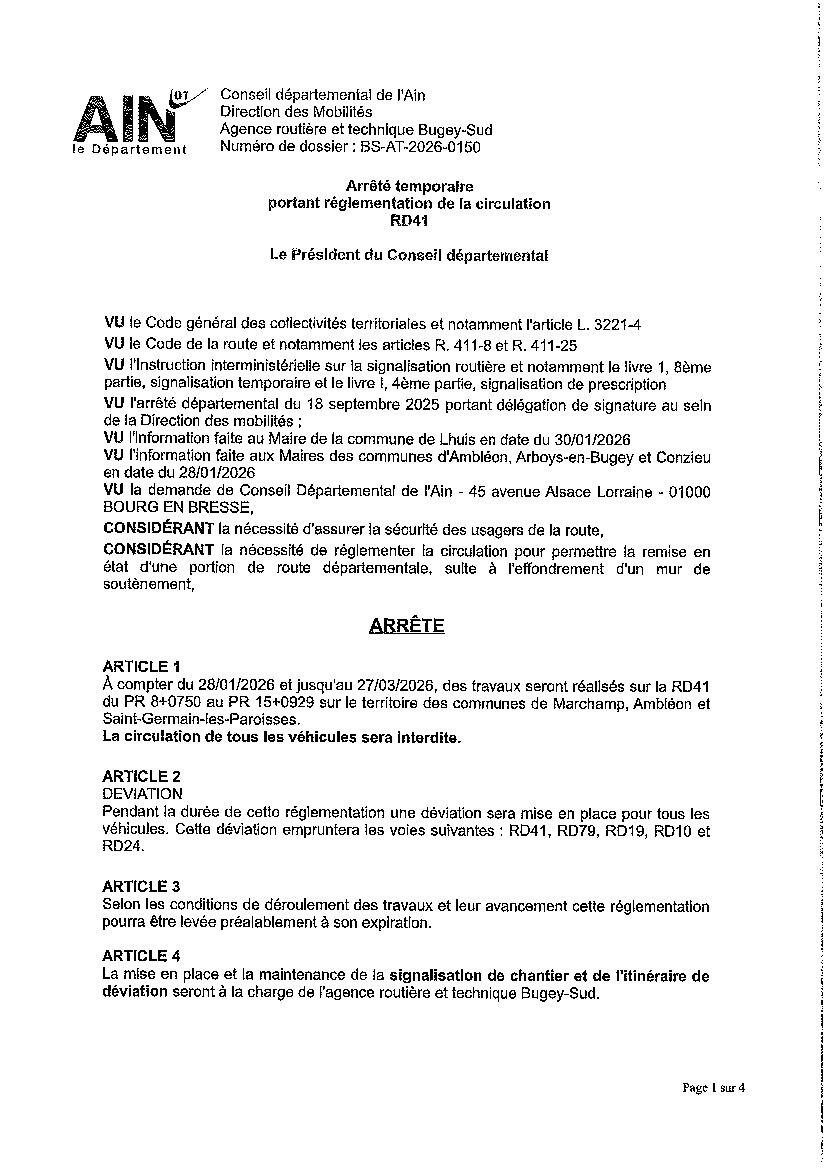 Réglementation de la circulation RD41 06/03/2026 Arrêté temporaire réglementation de la circulation RD41 Source : Mairie d'Ambléon