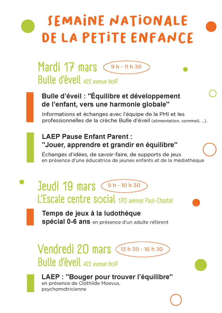 Du 17 - 20 mars 2026 à la crèche Bulle d'éveil & à L'Escale centre social, programme d'animations et d'échanges autour de la petite enfance.