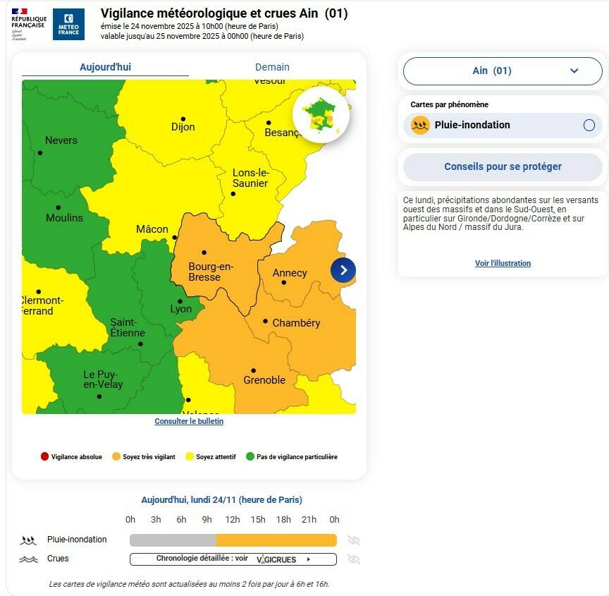Faits nouveaux : passage de l'Ain, des Savoies et de l'Isère en orange Pluie-Inondations