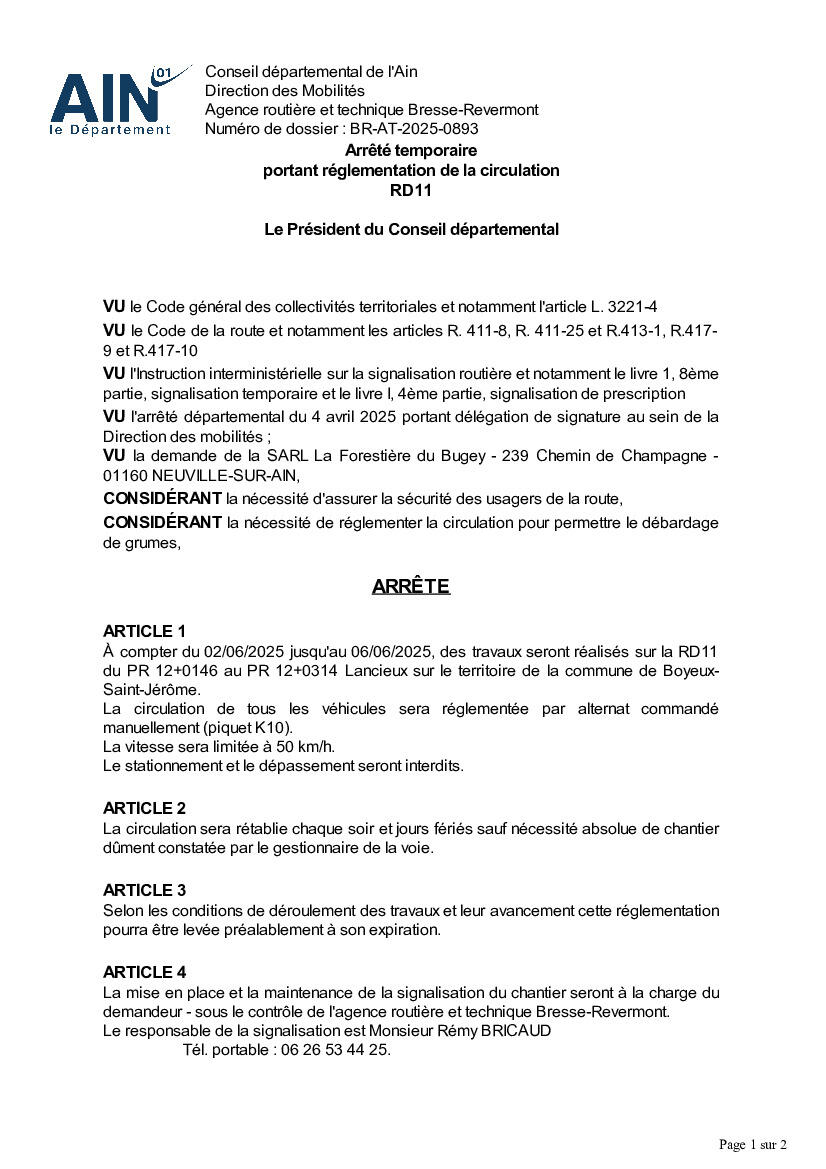 Chantier Route Rd11 (Route Du Lancieux) Du 2 Au 6 Juin 02/06/2025 Dépôt de grumes en bord de route.La circutation sera réglementée en journées par un alternat manuel. .