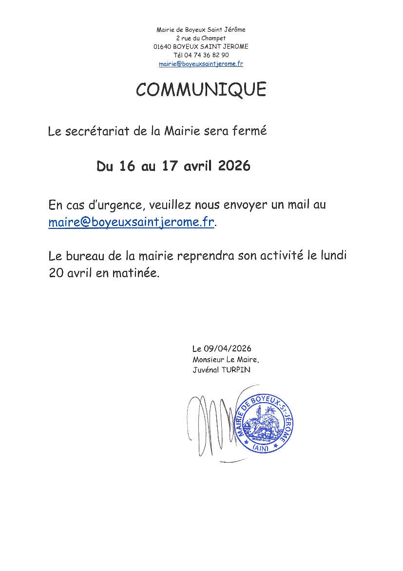 Fermeture Du Secretariat De La Mairie 09/04/2026 Le secrétariat de la mairie sera fermé du 16 avril au 17 avril 2026.