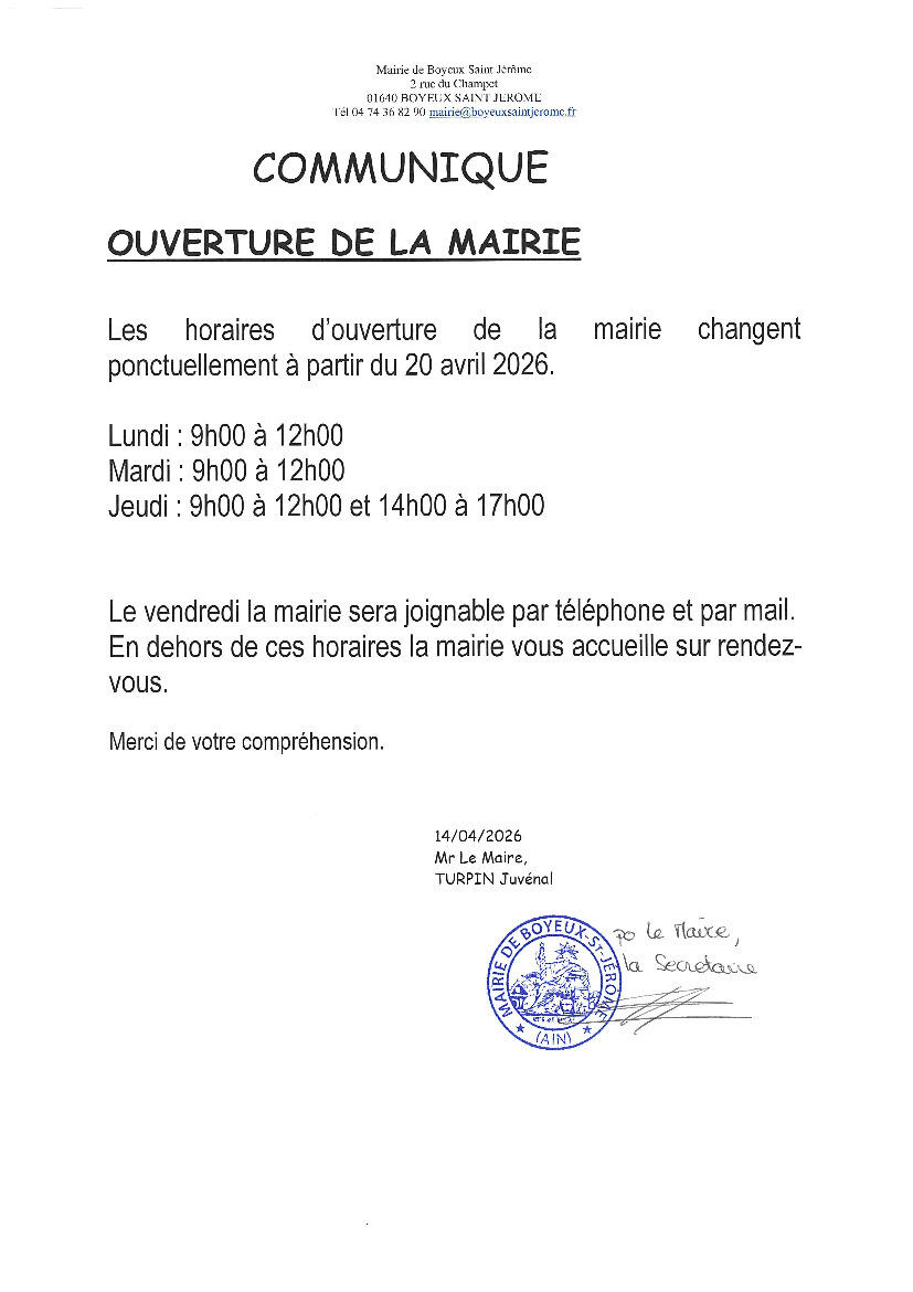 MODIFICATION DES HORAIRES D'OUVERTURE DE LA MAIRIE 17/04/2026 Les horaires d'ouverture de la mairie sont modifiés ponctuellement.