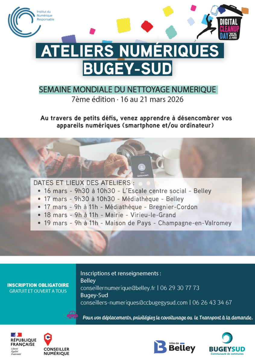 La communauté de communes Bugey-Sud, avec sa conseillère numérique et celle de la Ville de Belley, participe à la 7ᵉ édition de la Semaine mondiale du nettoyage numérique (Digital Clean Up Day), du lundi 16 au samedi 21 mars 2026, sur le territoire.