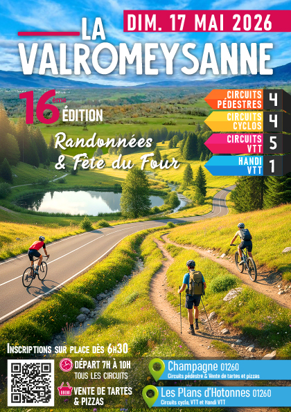 Dimanche 17 mai 2026 une dizaine d'associations du Valromey organise la 16ème Valromeysanne qui se compose de randonnées pédestres, cyclo, VTT et HANDI VTT et d'une fête du four.