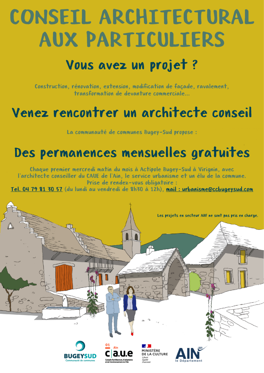 La communauté de communes Bugey-Sud, en partenariat avec le CAUE de l’Ain, propose des permanences mensuelles gratuites afin d’accompagner les habitants dans leurs projets de construction, de rénovation ou d’aménagement.