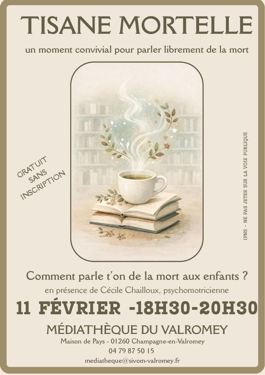 Tisane Mortelle 11/02 05/02/2026 TISANE MORTELLE Comment parle t'on de la mort aux enfants ? 11 février 18h30-20h30 Médiathèque du Valromey