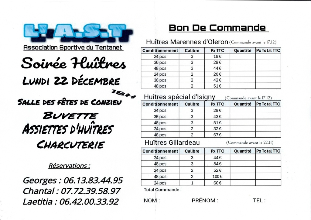 L'Association Sportive du Tentanet vous convie à sa soirée huîtres