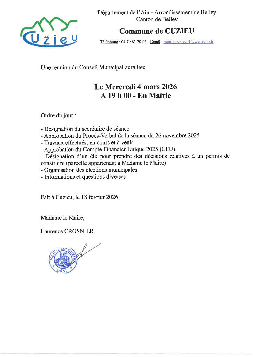 Prochaine Séance Du Conseil Municipal 25/02/2026 Madame, Monsieur, Le dernier conseil municipal de la mandature 2020-2026 aura lieu mercredi 04 mars prochain à 19h00. Veuillez trouver l'ordre du jour en pièce-jointe. Bien cordialement, La Mairie.